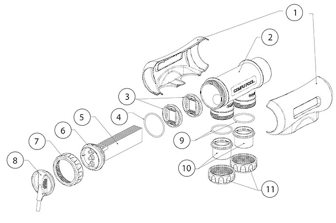 I have a Compupool CPSC48 and the o-ring goes between the Clear Electrode Housing Body (2) and the CPSC Series Electrode Housing Pipe Adapters (10). The o-ring (9) part number is JD363PIPO